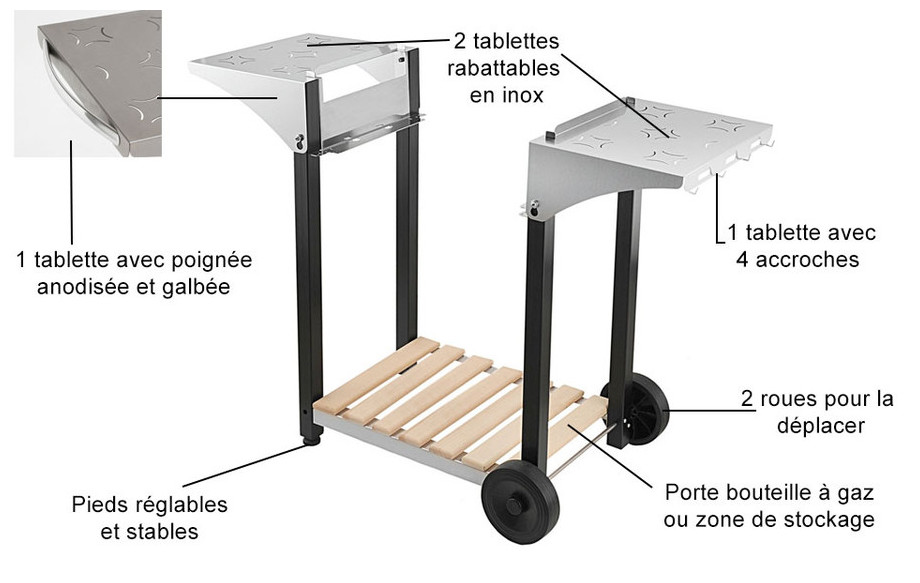 Les deux 2 tablettes rabattables se positionnent sur les côtés : l'une sert d'accroche ustensiles et de plan de travail, l'autre possède une poignée anodisée et galbée indispensable pour une bonne prise en main.