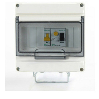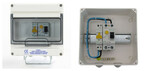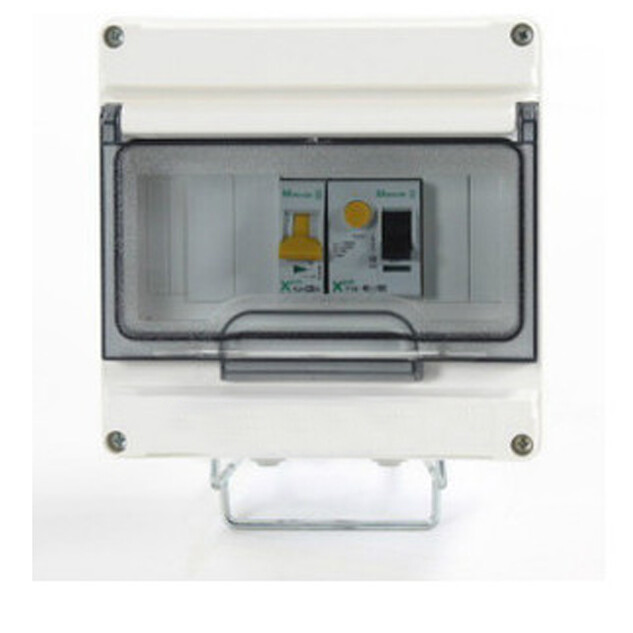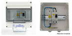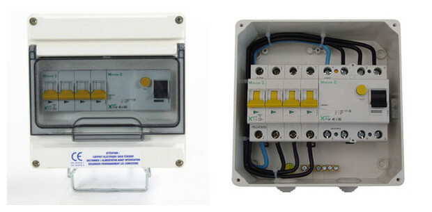 Coffret avec fenêtre en façade, permet de protéger une ligne d'alimentation (monophasée ou triphasée) par un interrupteur différentiel 30 mA et disjoncteur. Dimensions du coffret : 170 x 170 x 100 mm