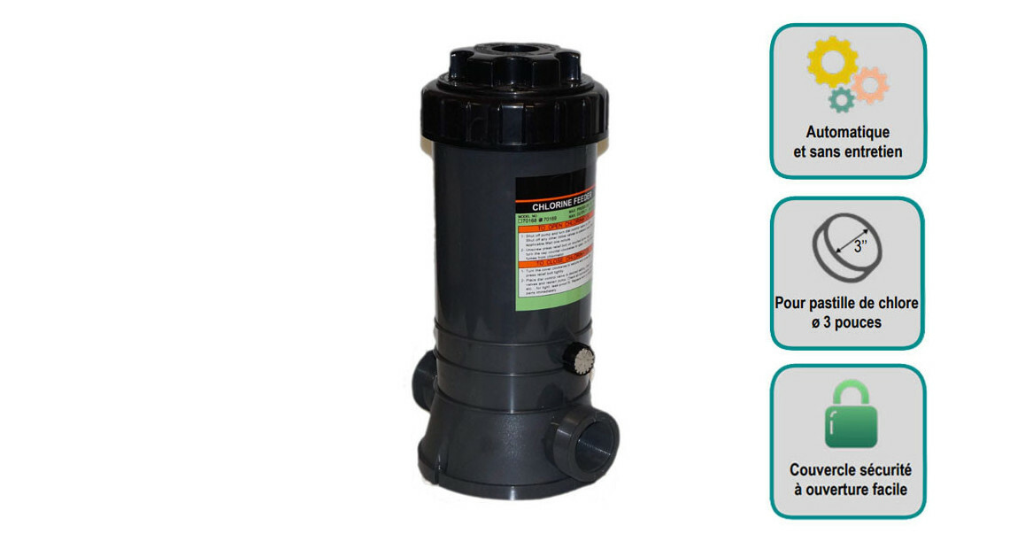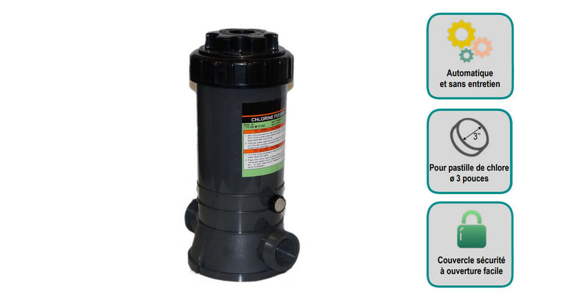Le doseur de chlore In-Line est un distributeur automatique pour pastilles de chlore résistant à la corrosion qui ne nécessite aucun entretien particulier.