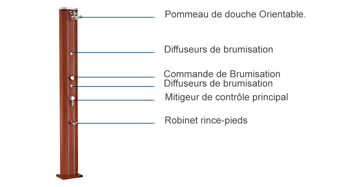 Description Douche solaire droite Alu aspect bois 40 L avec rince-pieds et brumisateur