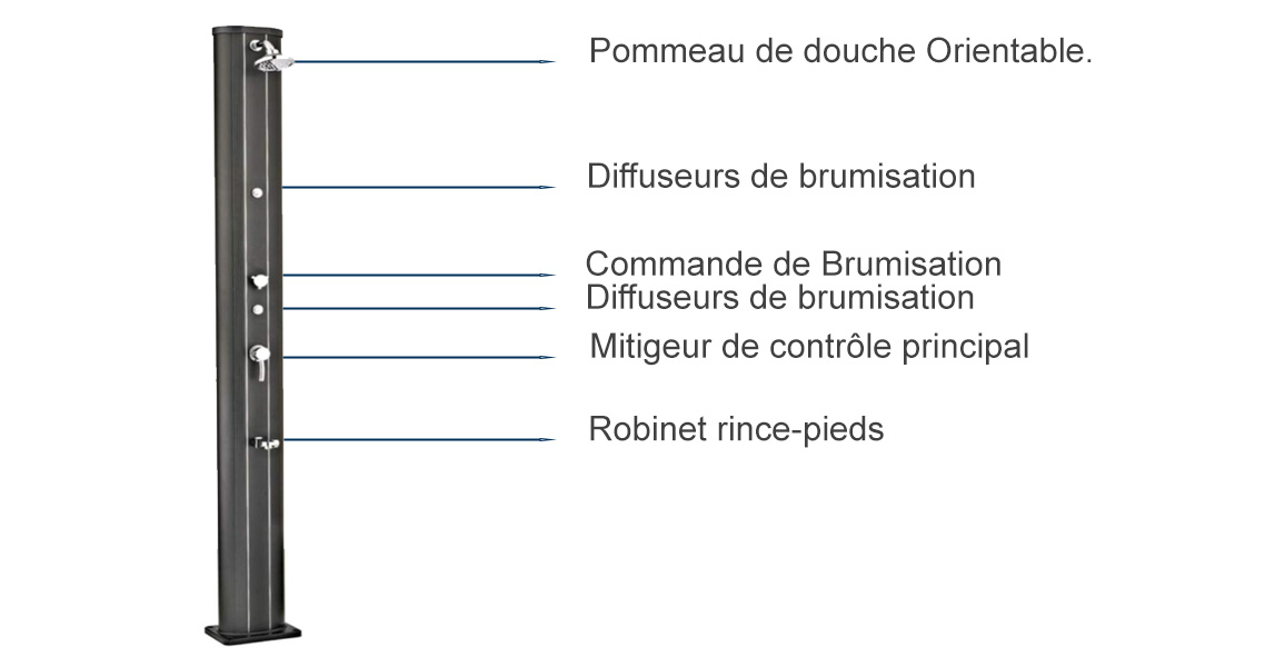 Description Douche solaire droite Alu noir 32 L avec rince-pieds et brumisateur