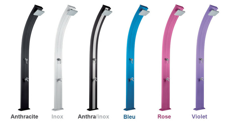 Anthracite, anthracite/inox*, gris anodisé*, rose, bleu ou violet, la douche So Spring est proposée en 6 coloris ultra-tendance à installer aux abords de votre piscine ou sur votre terrasse.