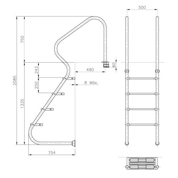 Échelle fabriquée en acier inoxydable AISI-316, de 500 mm de large. Tube Ø43 mm en acier inox poli. Marches type Luxe en acier inoxydable de sécurité, avec double surface anti-glisse. Pour un accès très pratique.