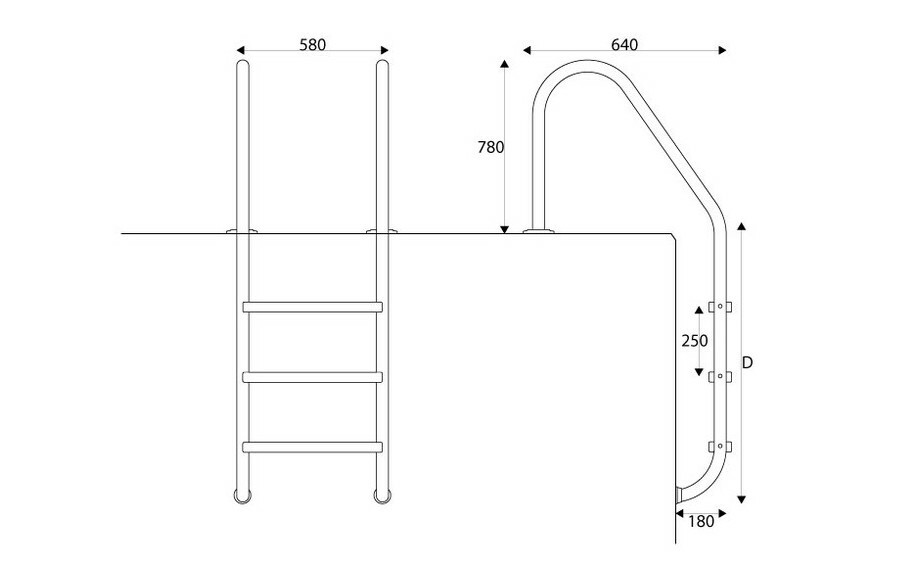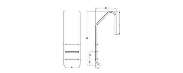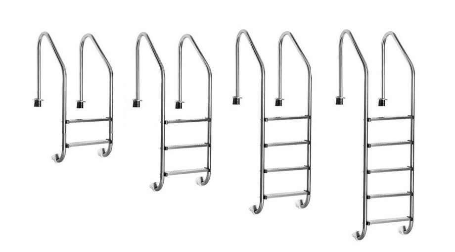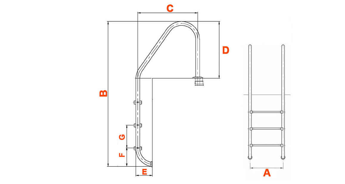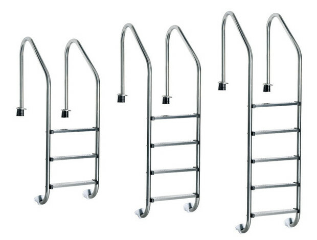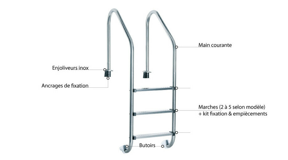 Marches en acier Inox AISI-304. l'échelle standard est livrée complète avec tous les accessoires nécessaires à son installation : ancrages de fixation à sceller et enjoliveurs inox.
