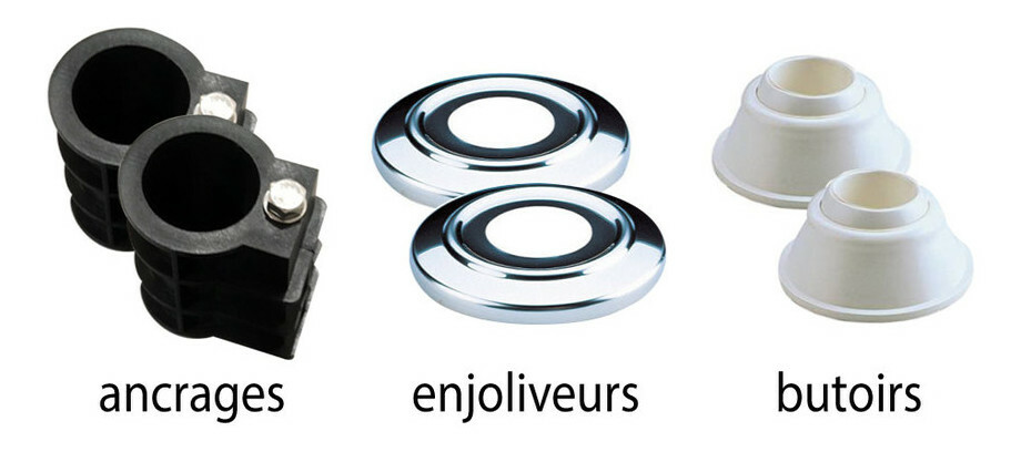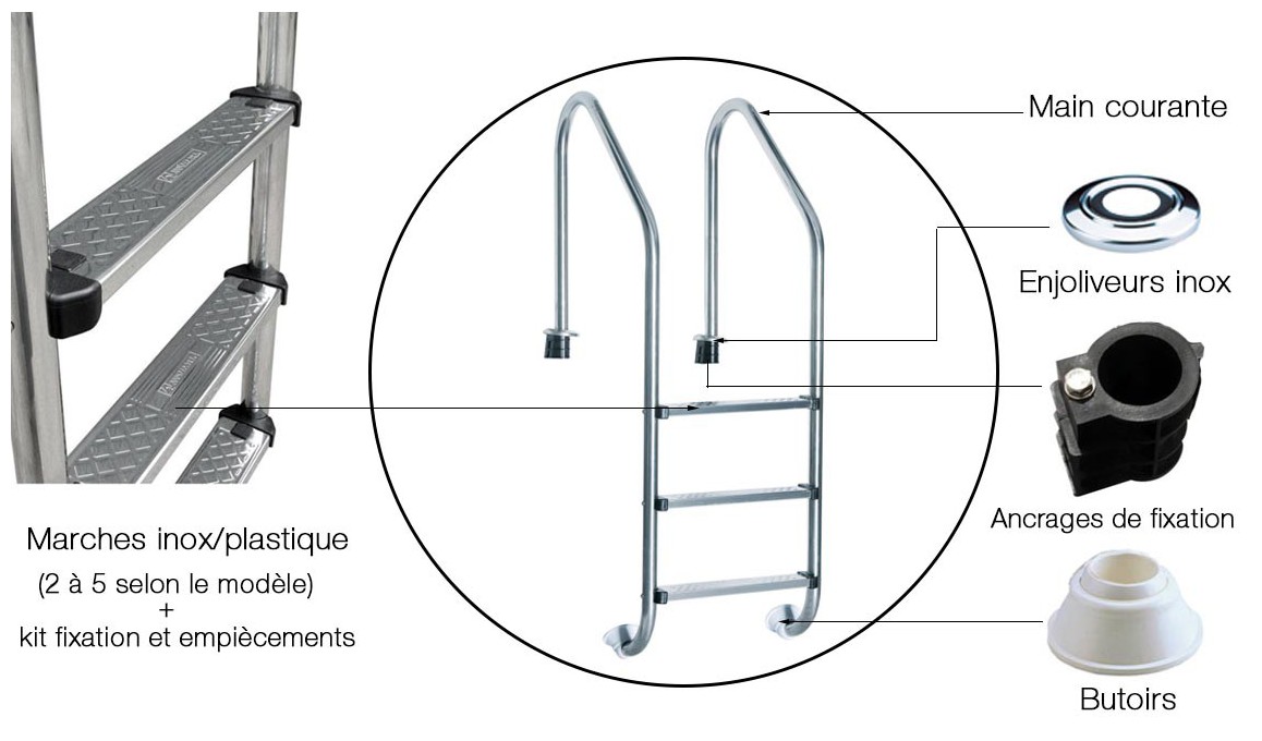 - Accessoires inclus: Ancrages de fixation, enjoliveurs et tampons inférieurs en plastique qui reposent sur la paroi de la piscine sans l'abîmer.