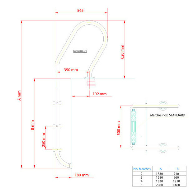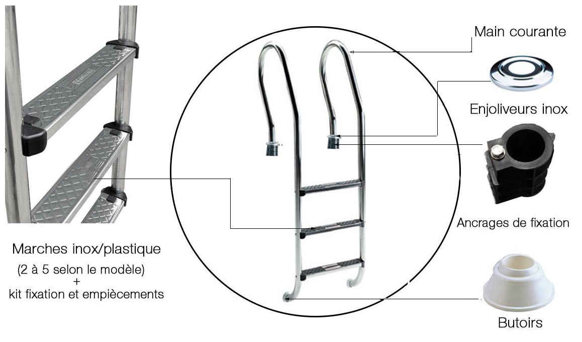 Livrée complète avec ancrages pour liaison équipotentielle : mise à la terre de l'échelle afin d'éviter les problèmes d'électrocution, l'inox étant un élément conducteur immergé dans l'eau.