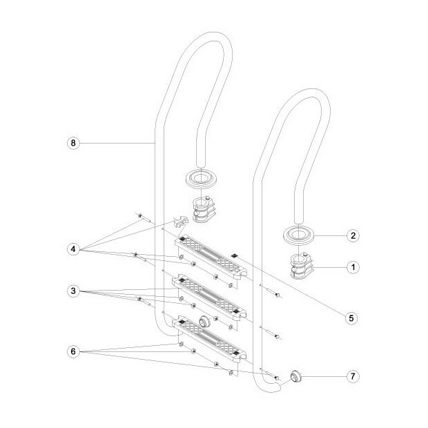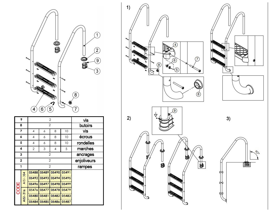 1- Ancrages 2- Enjoliveurs inox 3-4-5-6- Trois marches standard + kit fixations et empiècements 7- Butoir 8- Main courante