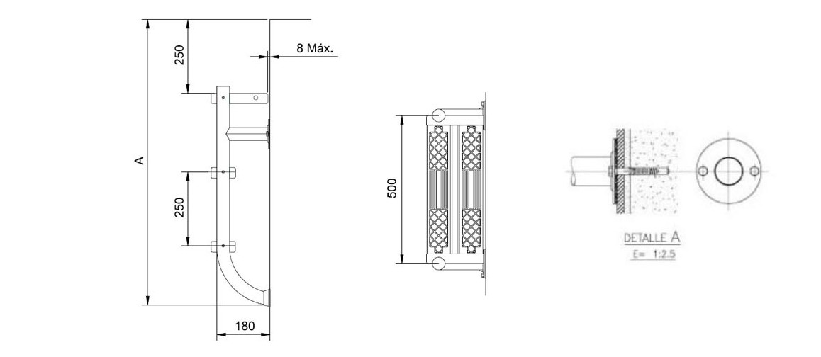 A - Effectuer les trous pour poser les chevilles, en utilisant la main courante comme gabarit. (se référer au mieux aux dimensions représentées sur le schéma d'installation ci-dessus)