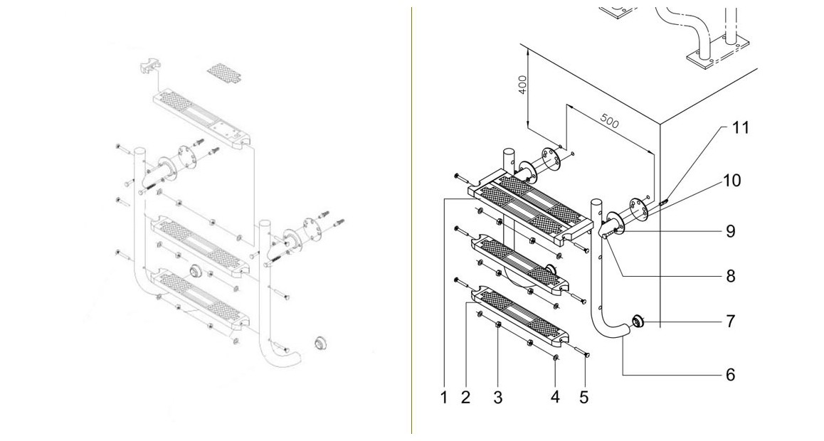 - Echelle sécurité 3 à 5 marches, avec première marche sécurité antiglisse double surface.