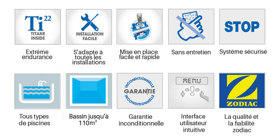 - Le Gensalt OE Cover Zodiac est doté d'une horloge de programmation intégrée afin de commander la filtration et les temps de production de chlore de manière indépendante.