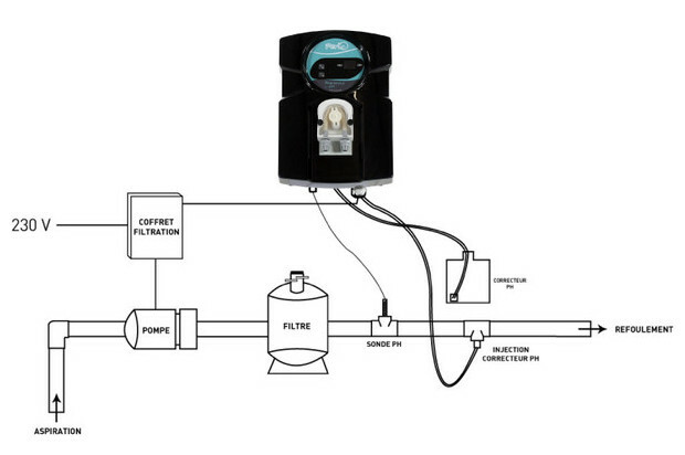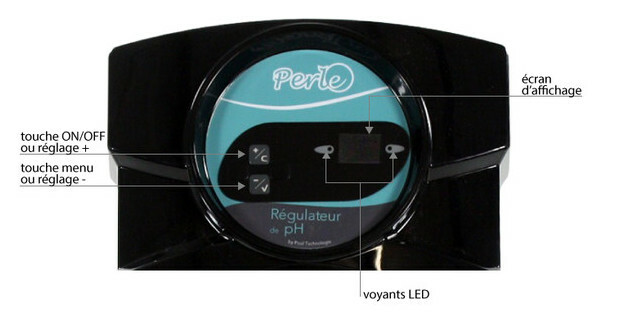 Le boîtier de régulation Perle permet la correction de la valeur pH de l'eau, constamment mesurée par la sonde. L'injection de liquide correcteur permet de maintenir le pH entre 7 et 7.2.