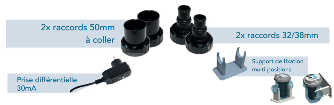 Raccords fournis | 2 types : 1.5" Ø 50 mm et Ø 32/38 mm | ||