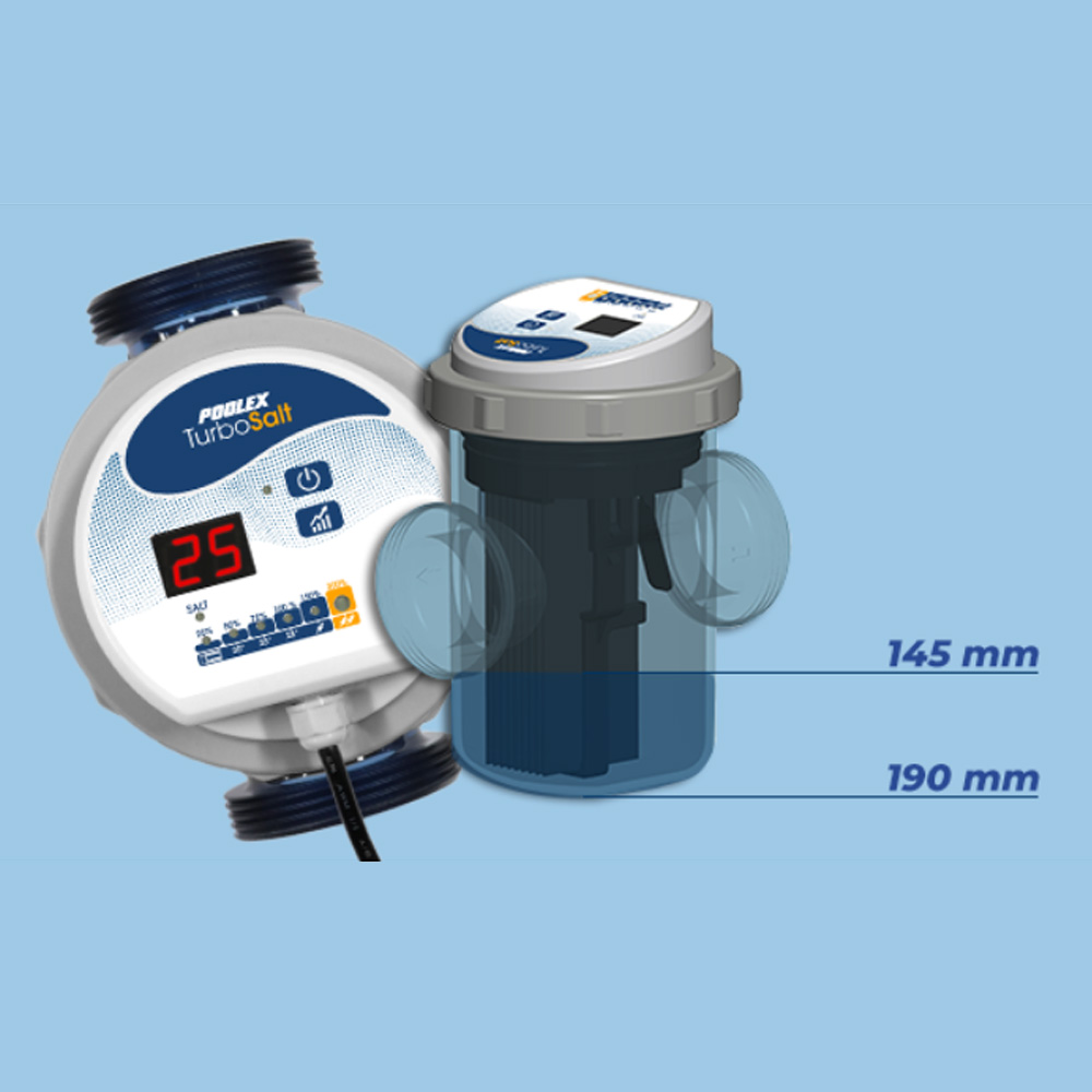 Le Turbo Salt est adapté aux bassins de 10 à 30 m³ et est équipé de raccords de 50 mm (1"1/2) ainsi que de raccords de 32/38 mm. Avec son support mural ou au sol, cet électrolyseur au sel convient à toutes les configurations de filtration, et sa conception ultra compacte lui permet de s'intégrer facilement même dans les espaces restreints des locaux techniques.