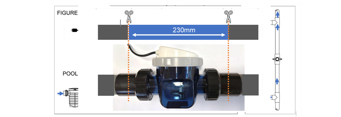 Pour insérer l'électrolyseur sur un tuyau existant (ou l'encombrent sur le tuyau) il faut couper sur 230 mm