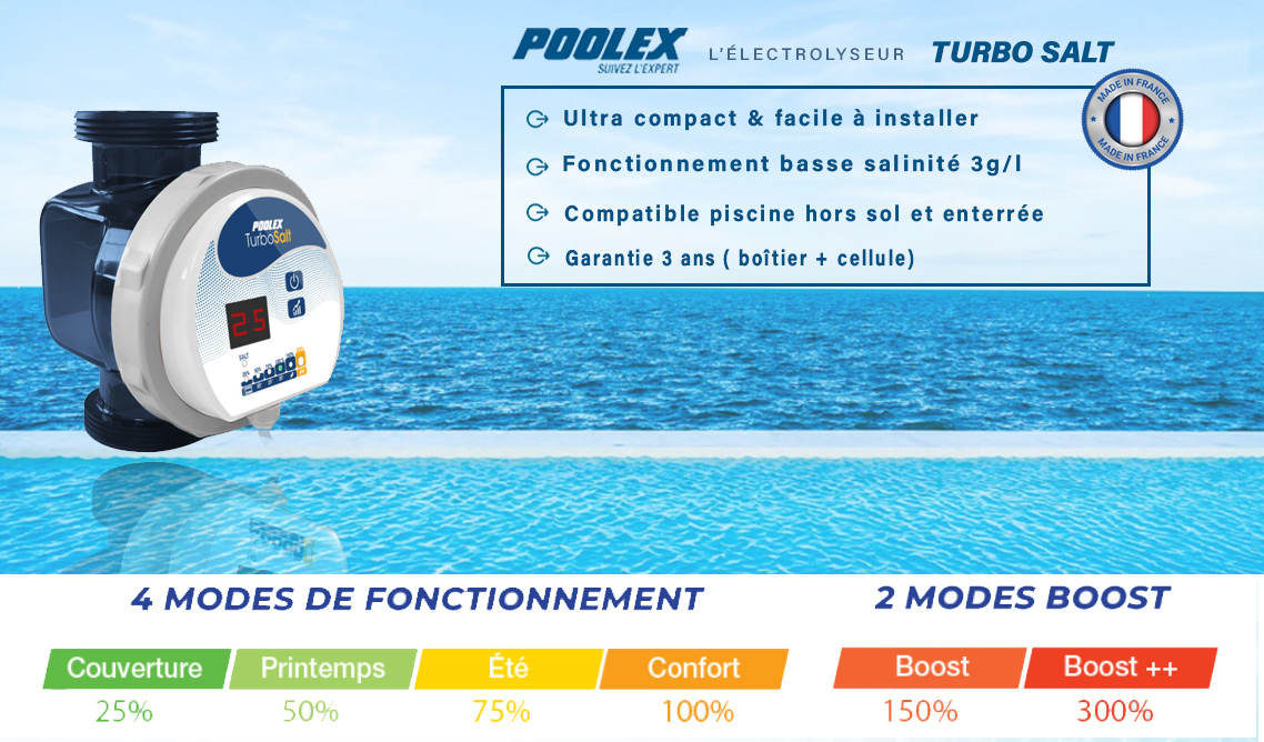 - Poolstar témoigne de sa confiance en la qualité de son électrolyseur au sel pour piscine en offrant une garantie jusqu'à 3 ans sur le Turbo Salt !