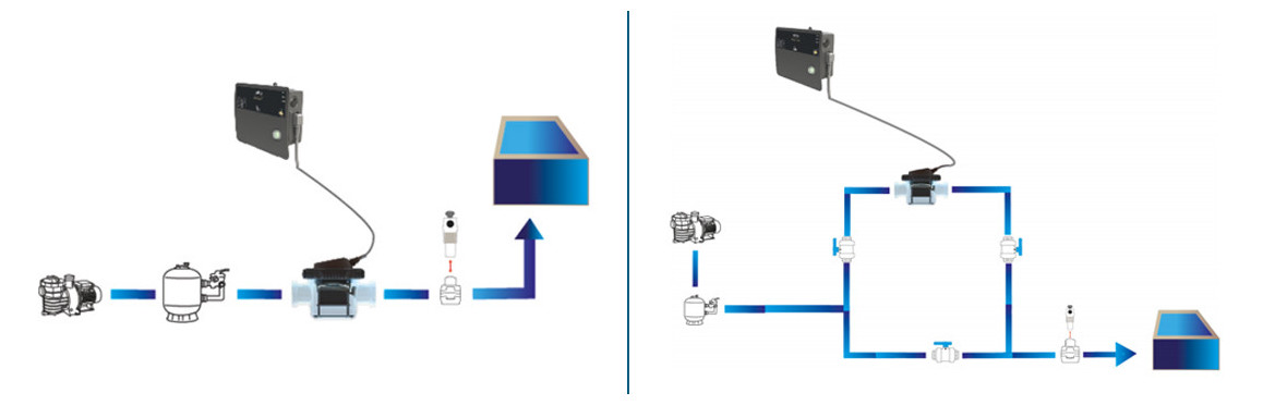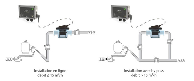 - Une installation en by-pass est préférable (nécessaire au-delà de 15 m³/h) afin de pouvoir contrôler le débit et le retirer sans arrêter la filtration.