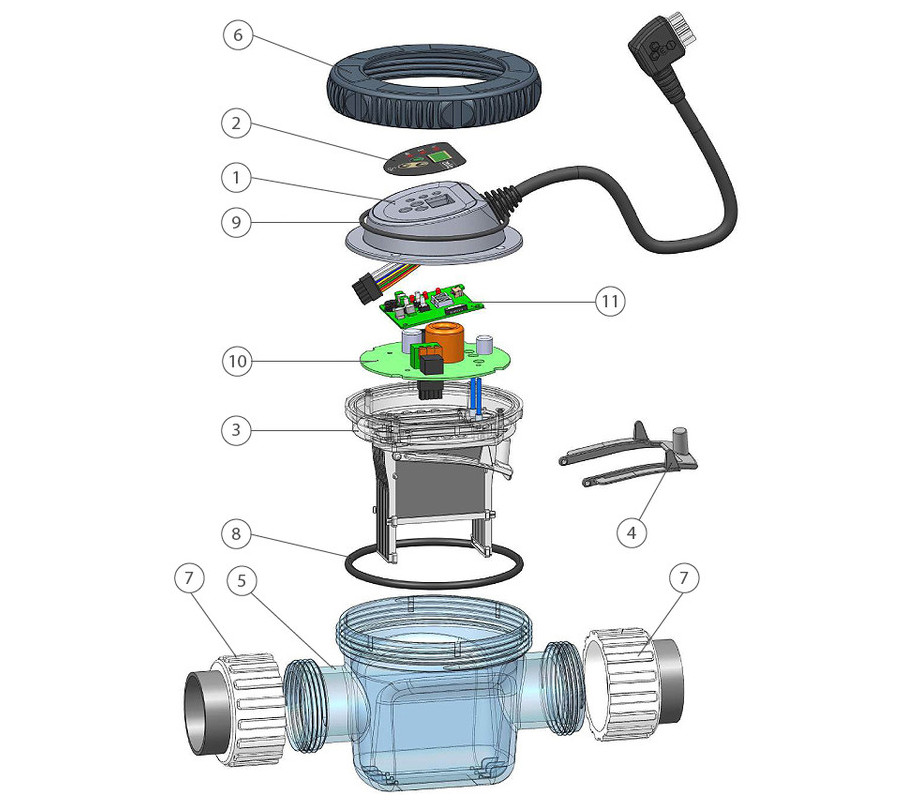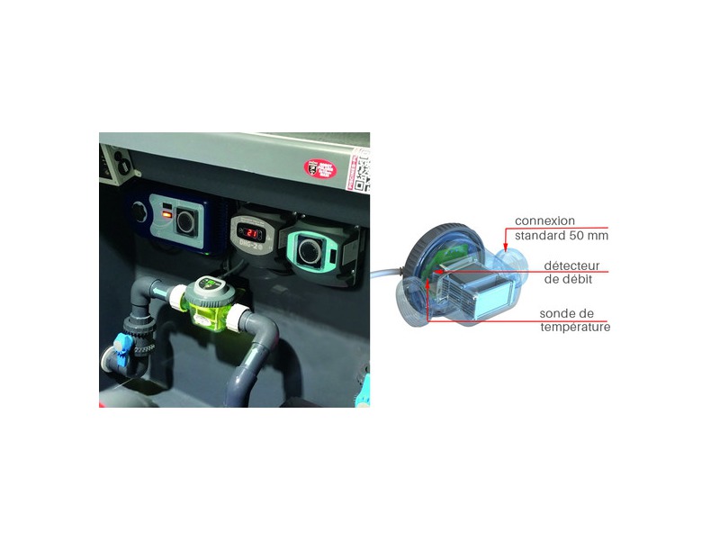 - Avec ses raccords union fournis, le Zelia Pod s'installe sur une canalisation de 50 mm de diamètre, en aval de la filtration (après le filtre).