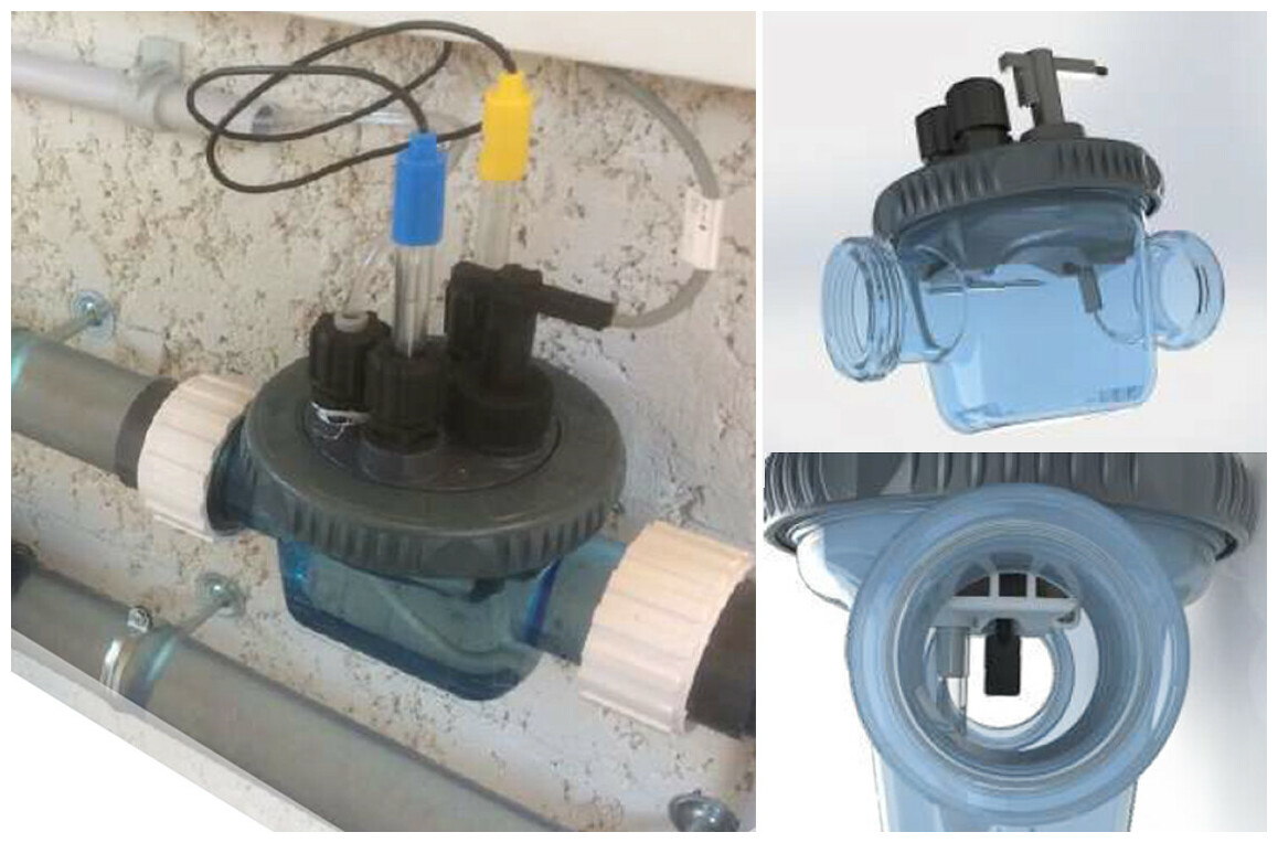 Compacte, La chambre de mesure et d'injection Zelia Pod contient de nombreux endroits pour les accessoires de traitement de l'eau de votre piscine : Pool Terre, détecteur de débit, injection pH, sonde, etc.