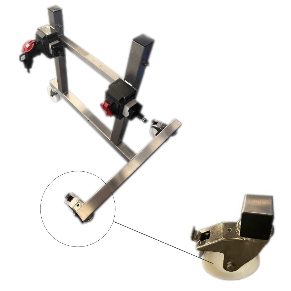 3 roues pivotantes Blickle dont 2 avec freins par trépieds soit 6 au total et dont 4 avec frein par enrouleur.