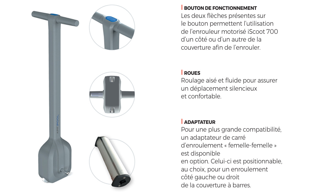 Caractéristiques - Enrouleur motorisé pour bâches à barres IScoot 810 bassin jusqu'à 12 x 5 m