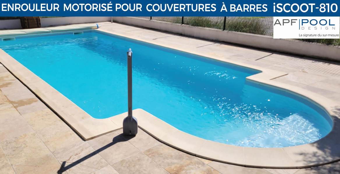 Nouveauté 2025, l'iScoot 810 d'APF Pool Design révolutionne l'enroulement des bâches à barres pour piscines de grandes dimensions, jusqu'à 12 x 6 mètres, escalier inclus.
