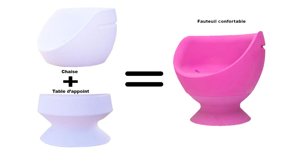 - Modulable : la partie assise se détache du pied pour se transformer en fauteuil bas + table d'appoint