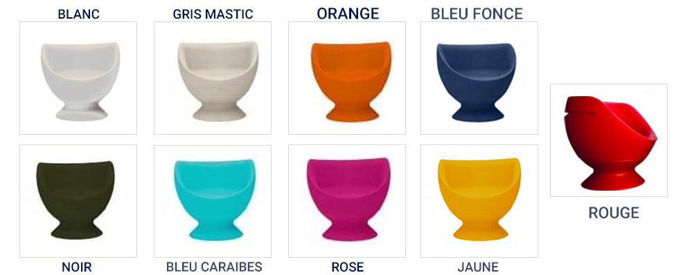 Blanc, Rose, Bleu Caraïbes, Bleu Foncé , Vert Anis, Orange, Jaune moutarde, Gris mastic, Noir.