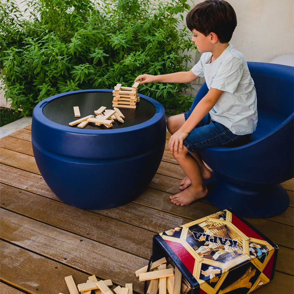 Le pied du fauteuil se détache facilement pour devenir une petite table d'appoint ou un support de jeu.
