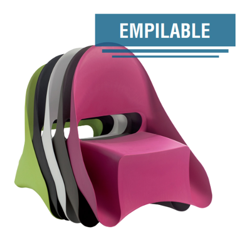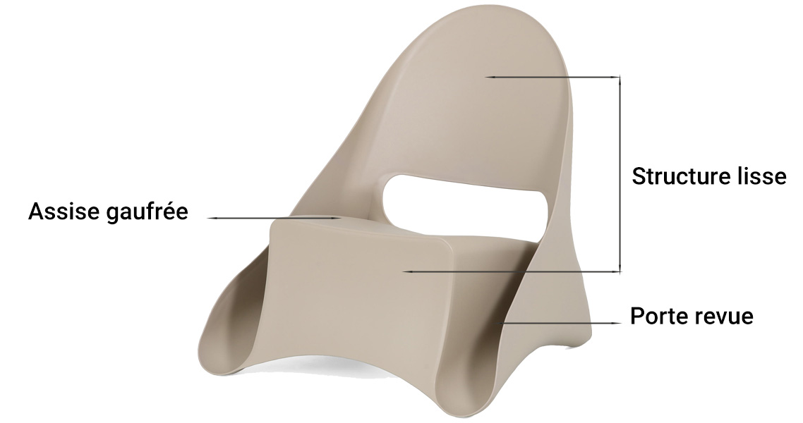 Fauteuil Ondule | Polypropylène monobloc (résine injectée) | H 75 × L 70 × P 75 | ~ 4 kg | Blanc, Anthracite, Taupe, Taupe clair | Résistant au vent, pluie, gel, eau et UV - Assise gaufrée - Structure lisse satinée - Empilable - Porte-revues intégré - Léger - Entretien facile | Extérieur : jardin, terrasse, piscine | 2 ans |