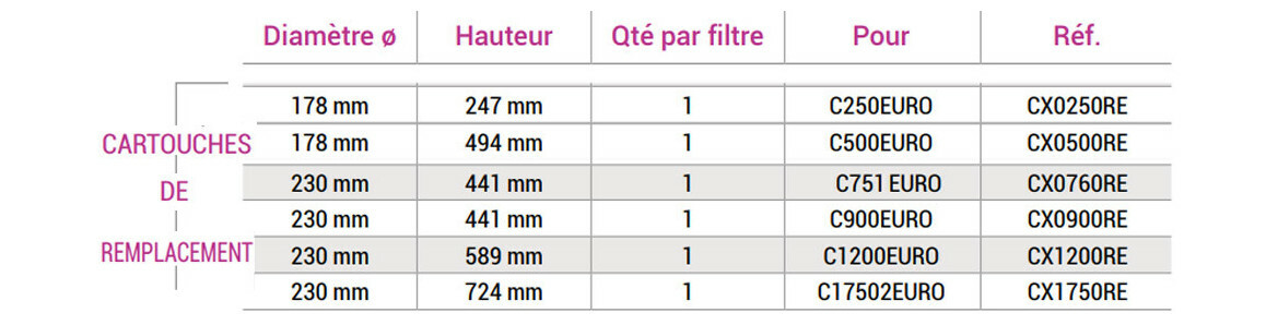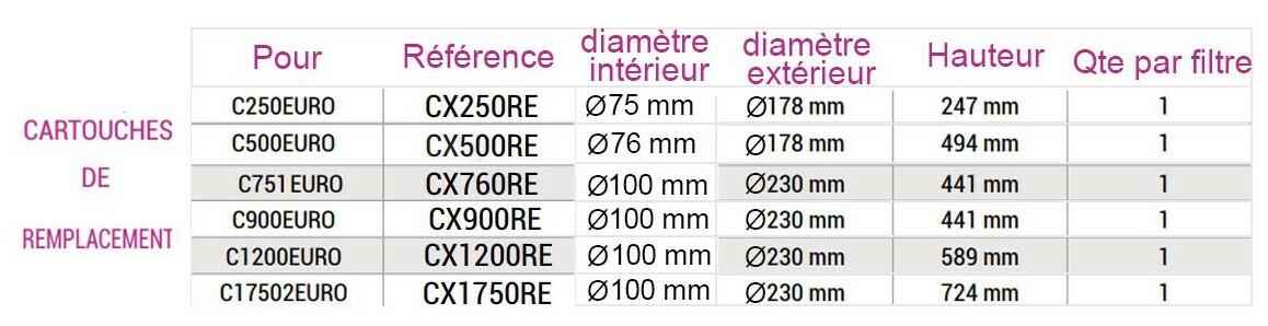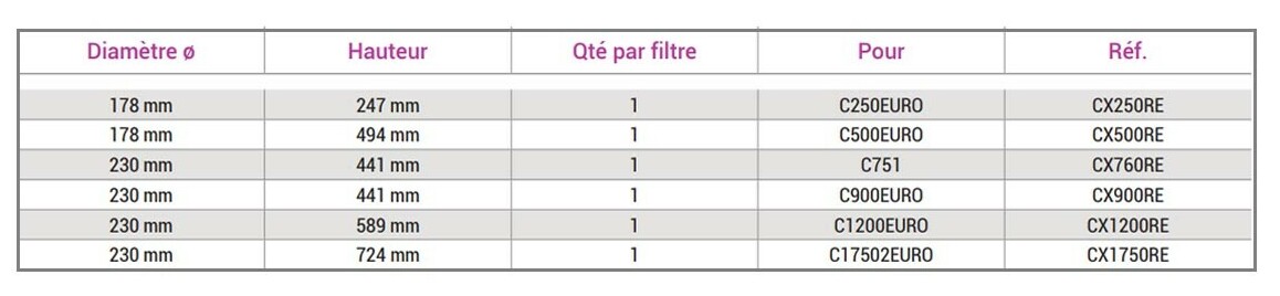 Référence cartouches | Référence filtre | Diamètre | Hauteur | Quantité par filtre? |