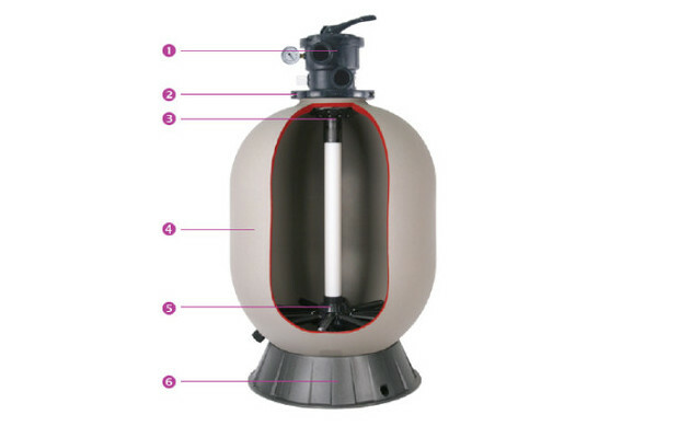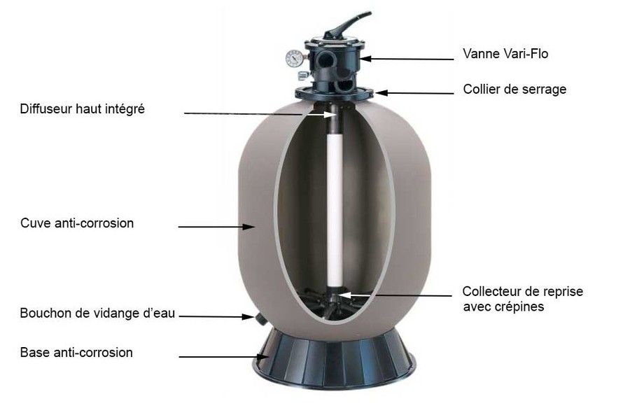 - Une cuve en polyéthylène soufflé haut densité, robuste et pouvant supporter la corrosion résultant de traitements chimiques, et les agressions dues aux intempéries et aux changements climatiques - Une base stable et résistante à l'usure, en ABS injecté - Une vanne TOP Vari-Flo (TM), avec 6 positions à définir grâce à loa poignée facile à manipuler. Un témoin intégré vous permet de garder le contrôle du cycle contre-lavage. - Un collier de serrage à rotation 360° pour un raccord rapide - Un diffuseur haut permettant une homogénéité de circulation de l'eau dans la charge filtrante. Une structure interne avec les tubulures étudiées pour une perte de charges minime. - Un collecteur de reprise d'eau hautement efficace, crépines perforées sur 360°, auto-nettoyantes - Un drain intégré et son bouchon pratique : il vous sert d'outil de démontage ! - Une grande flexibilité : le filtre Pro Top par Hayward peut contenir tout type de média filtrant : verre, sable, zéolithe, à vous de choisir !