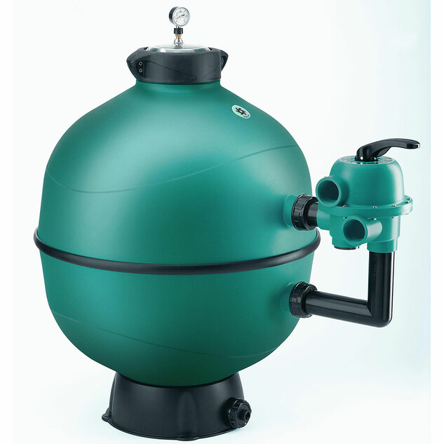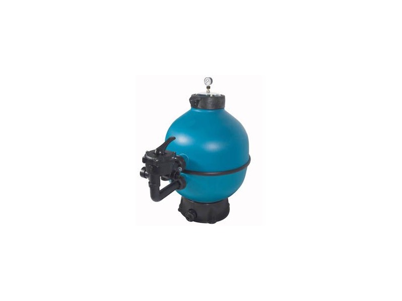 Filtre à sable compact et facile à entretenir, composé d'une cuve en deux partie fabriquée en matériaux résistants et assemblée par soudage.