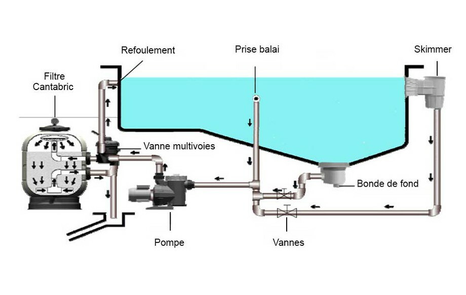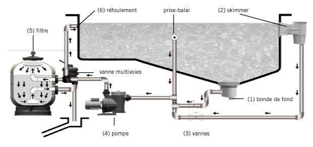 L'eau est aspirée du fond de la piscine par la bonde de fond (1) et à la surface par les skimmers (2) et arrivé au filtre (5) par des conduits séparés équipés chacun de #vannes (3). L'eau filtrée est ensuite refoulée à la piscine par les bouches (6). Ces bouches de refoulement sont installées du côté opposé des skimmers et de la bonde de fond renouvelant ainsi toute l'eau de la piscine.