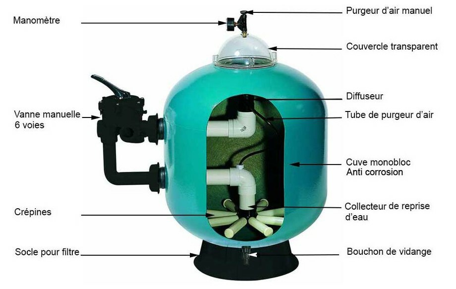 Le filtre à sable est le moyen le plus courant de filtrer l'eau. Peu contraignant, il ne demande que peu de soin, et offre un fonctionnement simple et efficace.