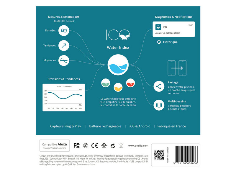 Oubliez le stress, la perte de temps et d'argent avec l’analyse de l'eau de votre bassin avec ICO ! Ce petit objet innovant, design, ergonomique et facile à utiliser a été conçu par Ondilo pour vous simplifier la vie ! Connecté au réseau sans fil de votre maison, il mesure en toute autonomie et en continu la qualité de l'eau : taux de pH et de Cl, le niveau de sel et la température puis vous transmet en temps réel toutes les données, les recommandations et les anomalies directement sur votre Smartphone ou tablette. Sa batterie se recharge une seule fois avant le début de la saison, via une prise USB et assure une autonomie d'un été !