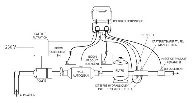 - Affichage : dosage, réglage dose/heure (produit rémanent), température eau et temps filtration conseillé