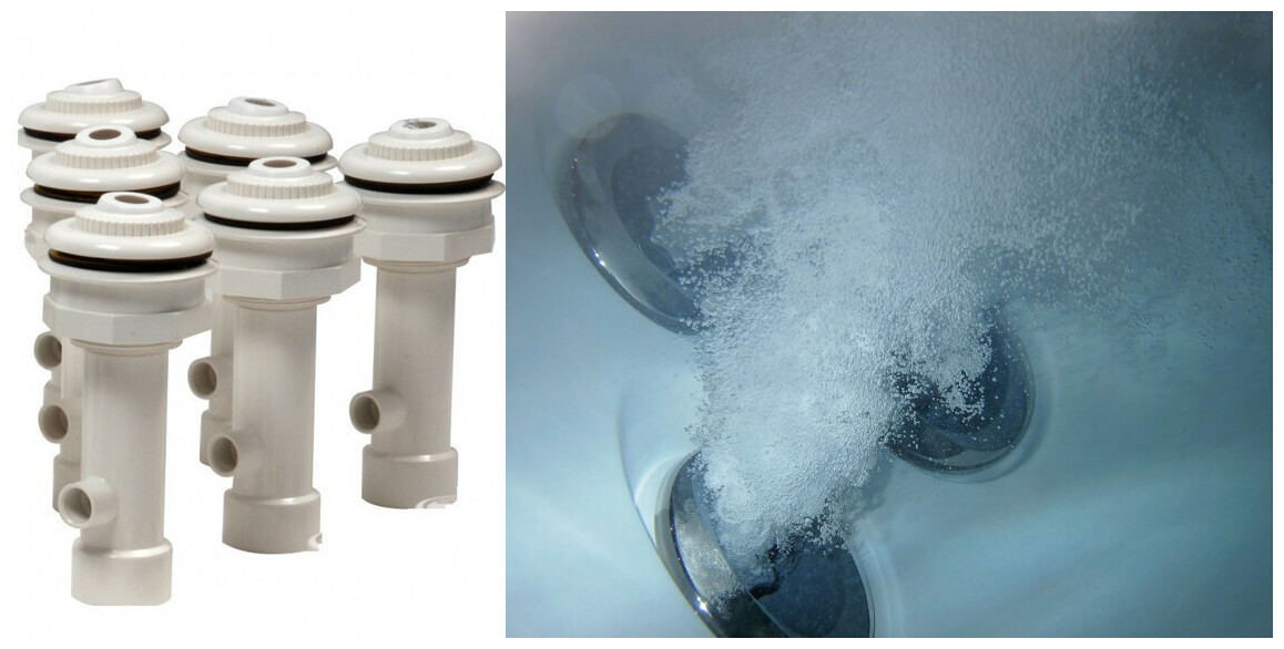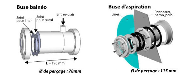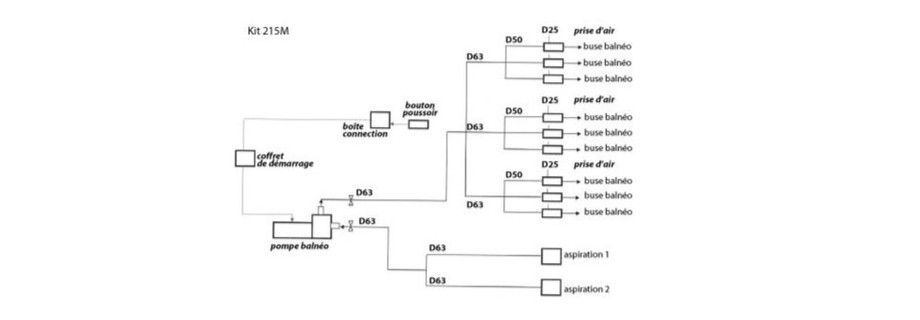 Concernant le système de massage avec buses "Venturi" pour les deux modèles de kits complets de balnéothérapie, les buses sont alimentées en eau par une pompe annexe (2 modèles de pompes proposés). L'air est prélevé dans le milieu environnemental et est mélangé à l'eau par les buses à l'aide d'un système venturi interne.