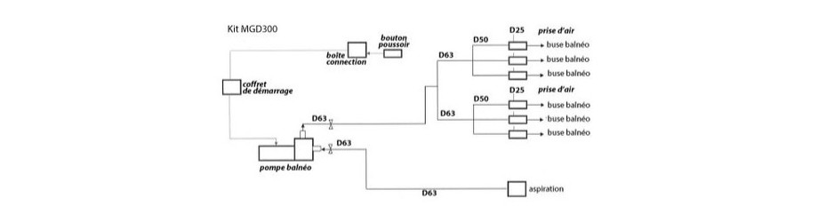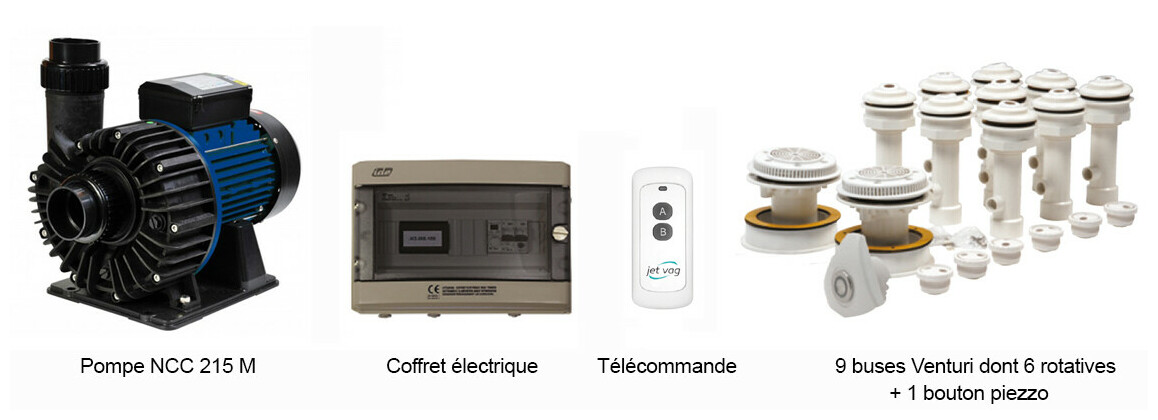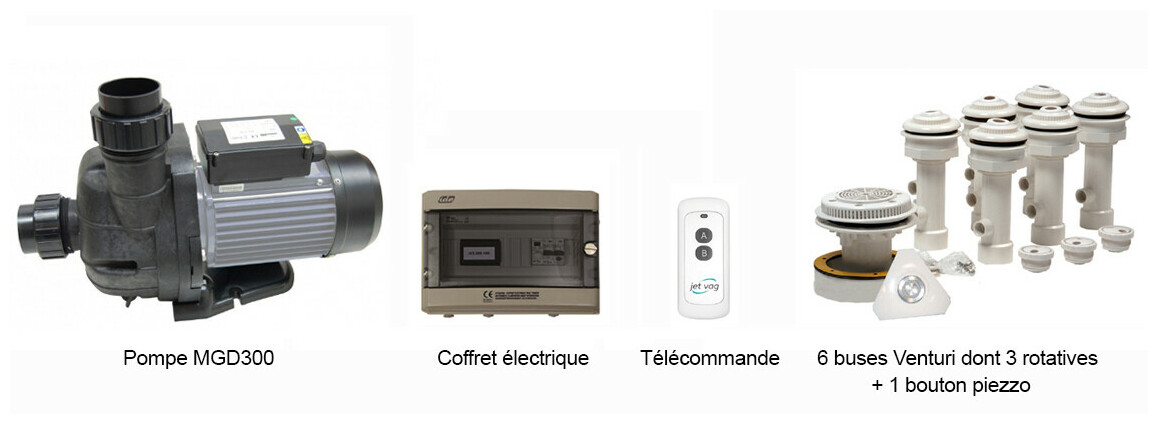 Les deux modèles de kit complet balnéothérapie pour piscine, qui sont proposés par Piscine center, ont des variantes techniques en adéquation avec vos besoins et en fonction de vos contraintes d'infrastructure. On citera le Kit balnéo avec pompe MGD 300M comprenant 1 pompe MGD, 6 buses, 1 buse d'aspiration,1 coffret, 1 bouton poussoir et commande pneumatique. Et le second modèle est le Kit balnéo avec pompe 215M : composé quant à lui d'1 pompe 215M, 9 buses, 2 buses d'aspiration, 1 coffret, 1 bouton-poussoir et 1 commande pneumatique.