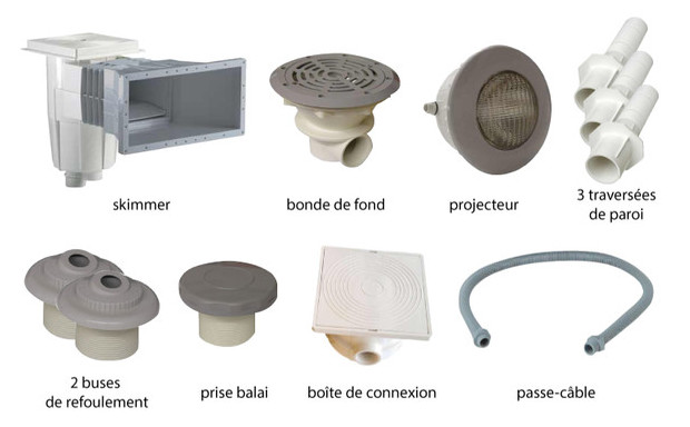 Kit composé pour équiper les piscines béton à la construction de touts les pièces à sceller nécessaires.