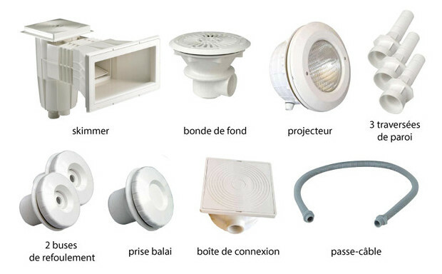 Prévu pour des piscines liner de dimensions maximales 8 x 4 m, cet ensemble est constitué de toutes les pièces à sceller nécessaires à la bonne circulation de l'eau.