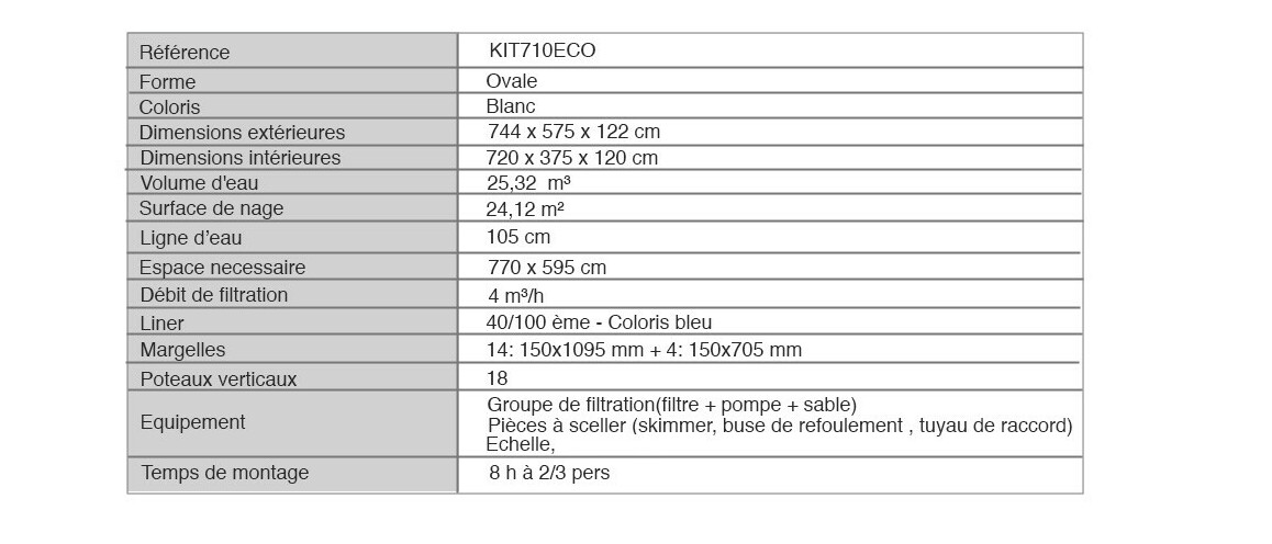 Avec ses belles dimensions ovales de 7.30 x 3.75 x 1.20 m, elle offre un espace de nage ou de jeux aquatiques agréable pour petits et grands.