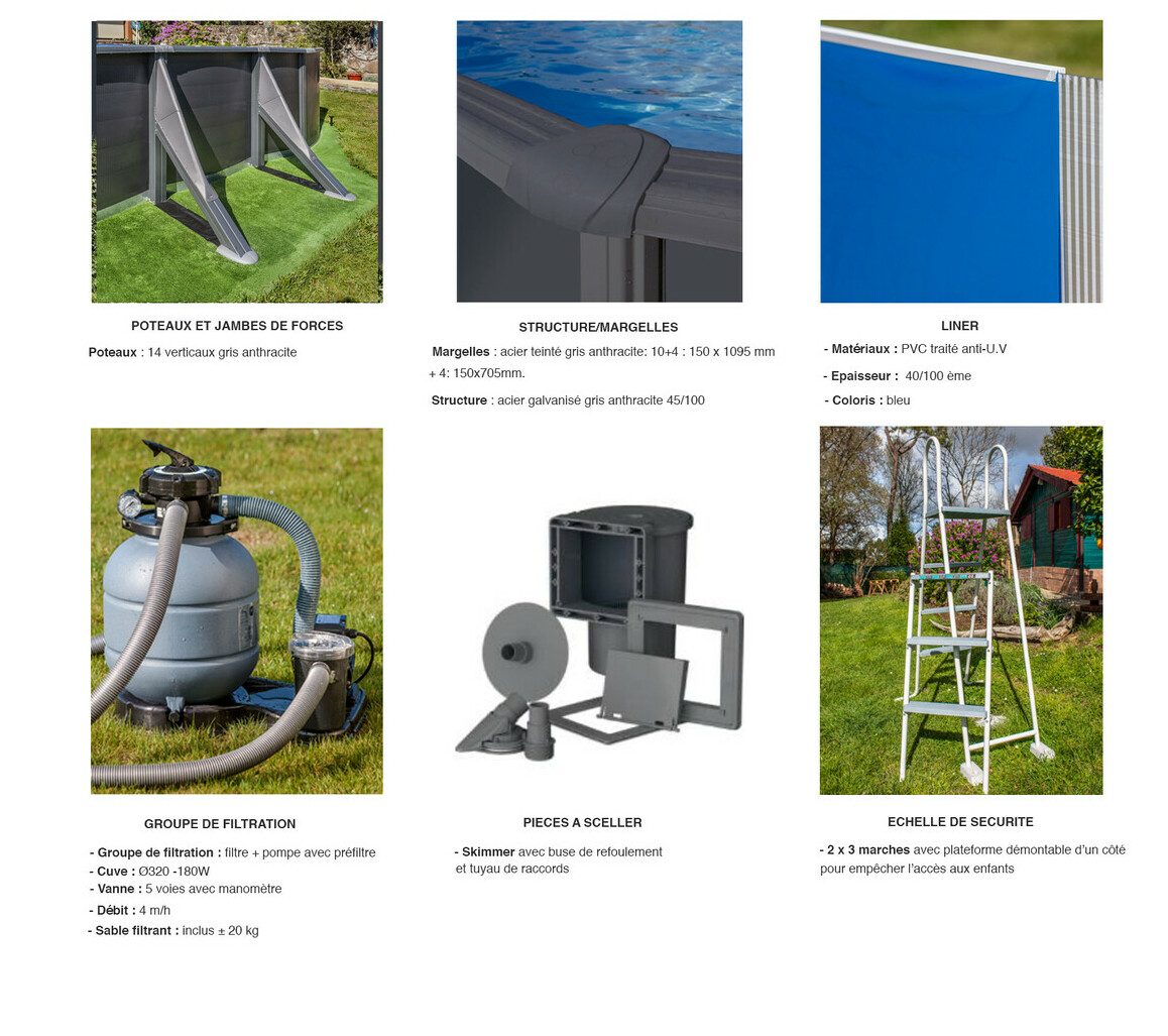 Le kit prêt à l'emploi de la marque Gre est fabriqué en acier de coloris gris, facile et rapide à installer qui permet de profiter "en un rien de temps" du plaisir de nager à la maison !