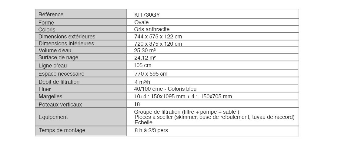 Description Kit piscine hors sol ovale 7.44 x 3.99 x H.1.22 m - acier gris anthracite