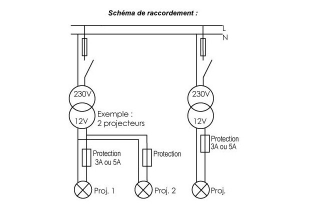 - Alimenter les projecteurs en Très Basse Tension de Sécurité ; utiliser un transformateur avec tension de sortie 12V