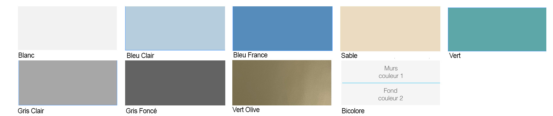 Disponible dans un choix de 14 coloris imprimés + option bicolore couleurs au choix parois/fonds : Blanc, Bleu Clair, Bleu France, Sable, Vert, Gris Clair et Gris Foncé afin de répondre aux goûts de chacun.