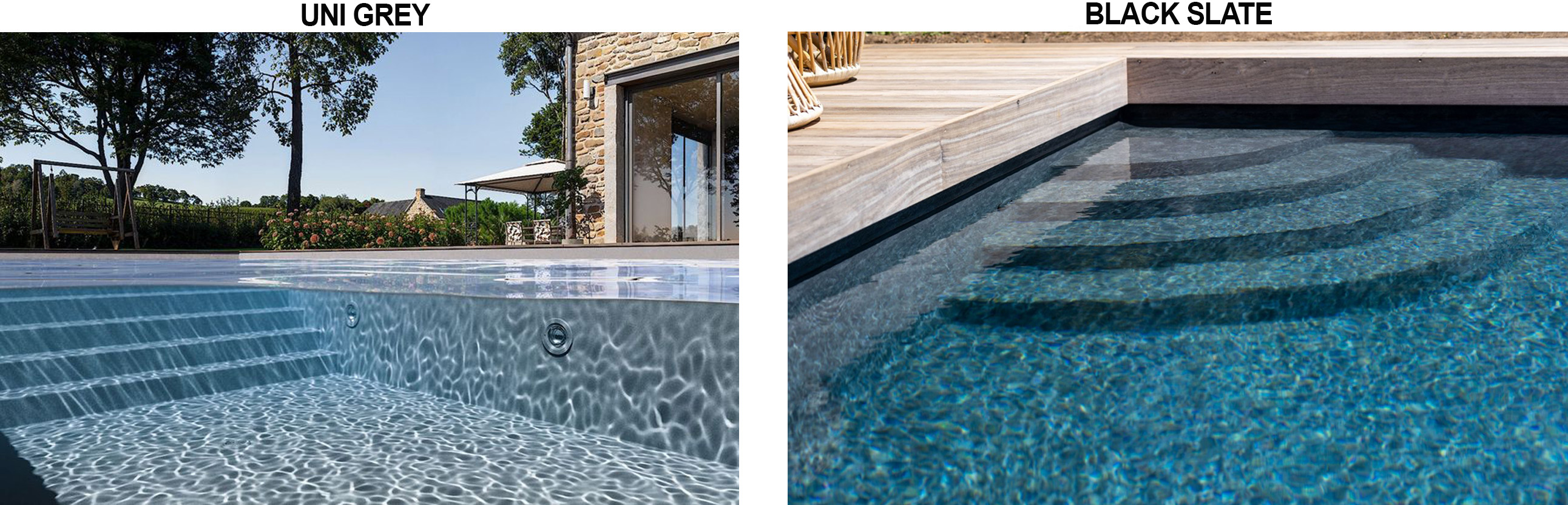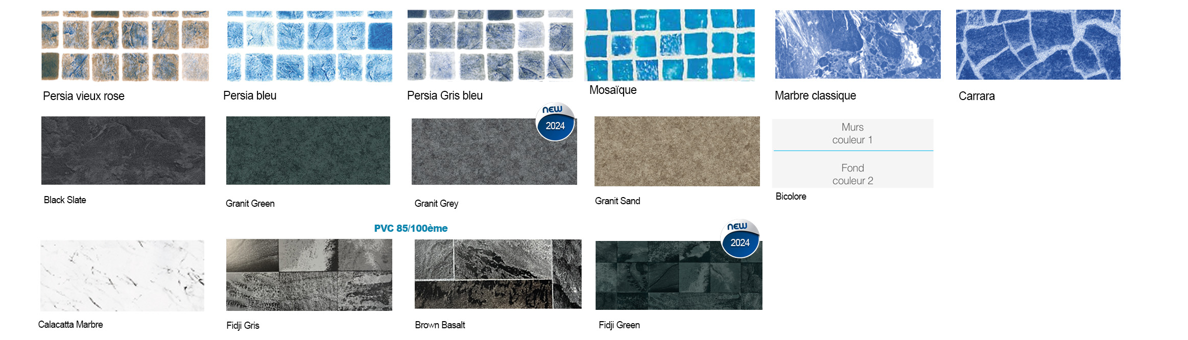 - Conformité norme classe supérieure NFEN 15-836-1 - Liner 75/100e verni - Fabrication 100% Française - Etanchéité et soudures garanties 15 ans - 8 coloris unis vernis ou option bicolore couleurs au choix murs/fond - Entretien facilité de la ligne d'eau - Vernis Anti-tâches contre les bactéries 3 ans - Protection anti-UV - Utilisation en eau jusqu'à 33 degrés - Garantie 15 ans pleins + 3 ans anti-taches | - Conformité norme classe supérieure NFEN 15-836-1 - Liner 75/100e - Fabrication 100% Française - Etanchéité feuille et soudures sont garanties 10 ans, - 5 coloris unis + option bicolore couleurs au choix murs/fonds - Utilisation en eau jusqu'à 28 degrés - Garantie 10 ans pleins | - Conformité norme classe supérieure NFEN 15-836-1 - Liner 75/100e verni ou 85/100e verni (selon modèle) - Fabrication 100% Française - Etanchéité et soudures garanties 15 ans - Garantie des 3 premières années contre les tâches. - 14 coloris imprimés vernis ou option bicolore couleurs au choix murs/fond - Entretien facilité de la ligne d'eau - Protection anti-UV - Utilisation en eau jusqu'à 33 degrés - Garantie 15 ans pleins + 3 ans anti-taches | - Conformité norme classe supérieure NFEN 15-836-1 - Liner 95/100e verni antidérapants - Fabrication 100% Française - Etanchéité et soudures garanties 15 ans - Garantie des 3 premières années contre les tâches. - 4 coloris imprimés vernis et 1 coloris uni ou option bicolore couleurs au choix murs/fond - Entretien facilité de la ligne d'eau - Protection anti-UV - Utilisation en eau jusqu'à 33 degrés - Garantie 15 ans pleins + 3 ans anti-taches | - Conformité norme classe supérieure NFEN 15-836-1 - Liner 85/100e - Fabrication 100% Française - Etanchéité et soudures garanties 15 ans - 6 coloris unis - Résistance aux variations de température jusqu'à 33 degrés - Garantie 15 ans pleins |