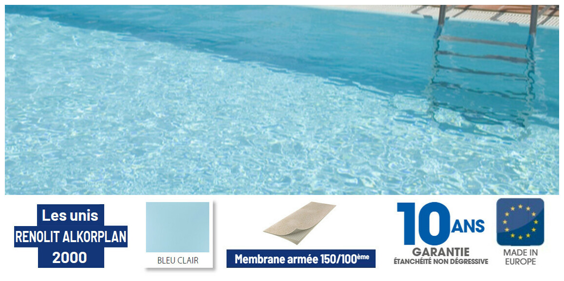 La membrane armé Renolit Alkorplan est un revêtement PVC étanche et esthétique pour piscines enterrées en construction ou en rénovation.