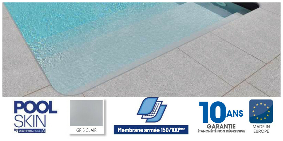 Poolskin est un liner armé uni verni gris clair d'une épaisseur de 150/100 ème et conditionné sous forme de rouleau, en vente selon la quantité désirée.
