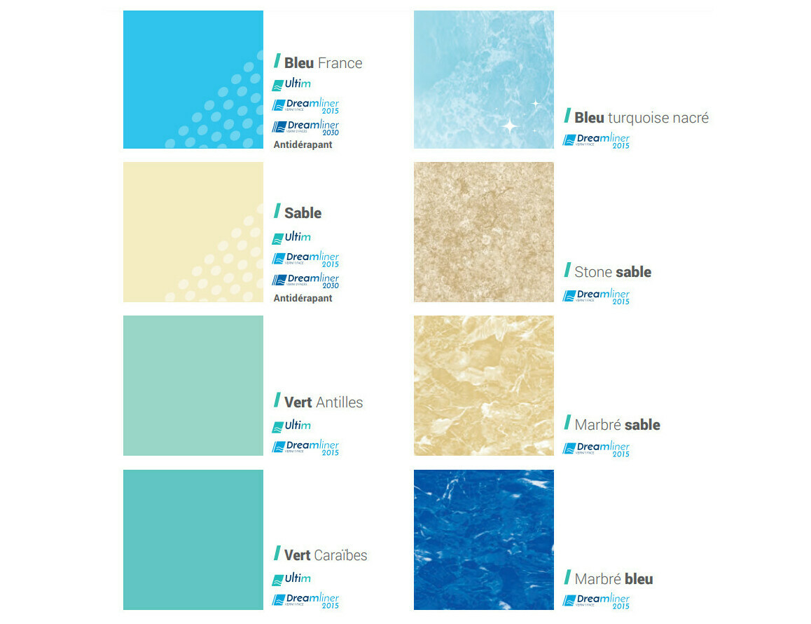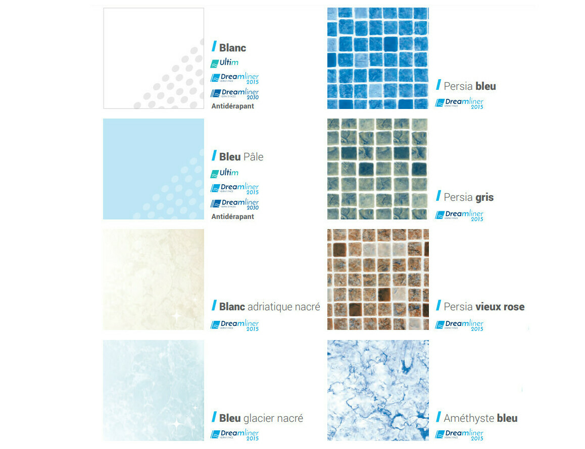 - Dreamline 2030 : des liners 75/100ème dédiés à la rénovation des bassins existants grâce au vernis présent sur les 2 faces. Une protection supplémentaire contre la pollution de la maçonnerie et une limitation de la formation de plis.
