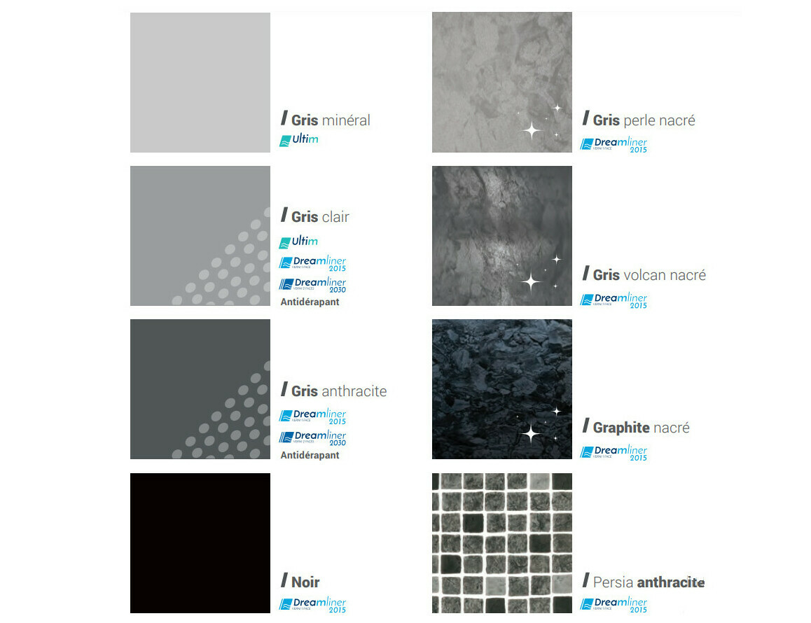 Les coloris blanc, bleu pâle, bleu France, sable, gris clair et gris anthracite sont déclinés en antidérapants grainés ou à picots sont certifiés classe C et ont été évalués avec succès à un angle d'inclinaison d'au moins 28°.